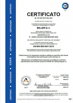 Belleri S.r.l. obtained certification for its quality management system in 2010, in accordance with ISO 9001:2008.